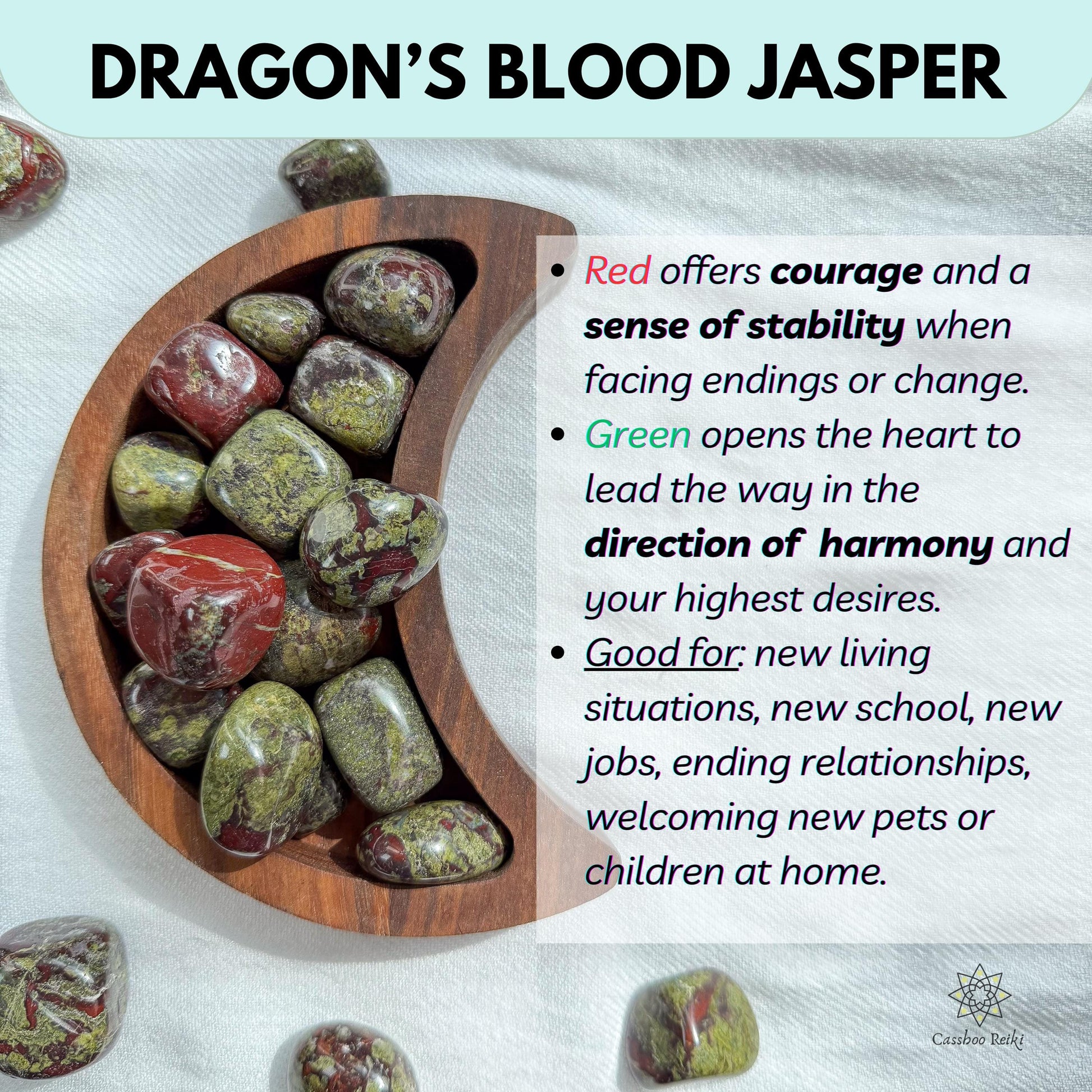 Dragon‘s Blood Jasper helps with managing and overpowering trigger responses or patterns that keep us in a "safe" or "comfortable" situation.