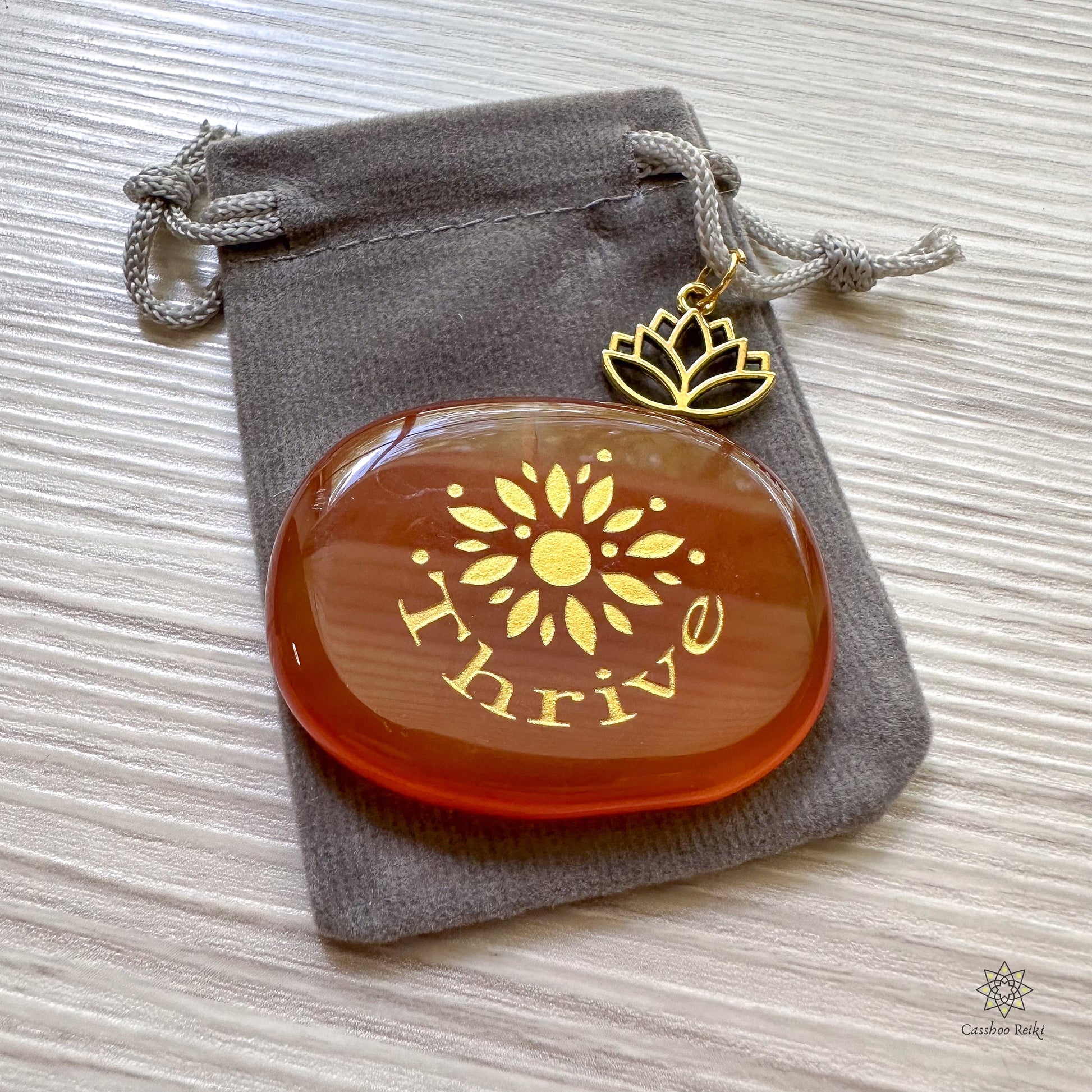 Engraved Palm Stone. Thrive in Carnelian | Sacral Chakra Stone