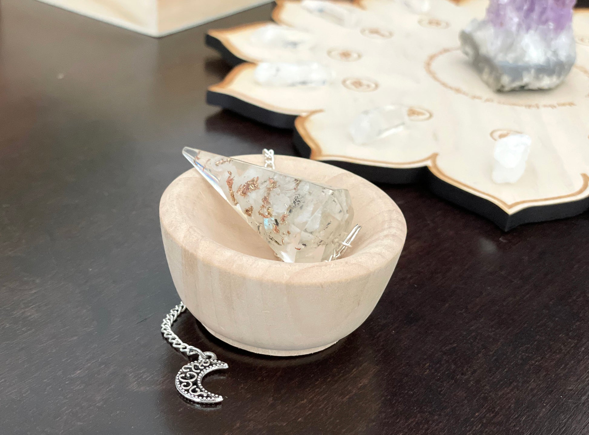 - 1 pendulum of your choice and a mini wooden bowl for storage