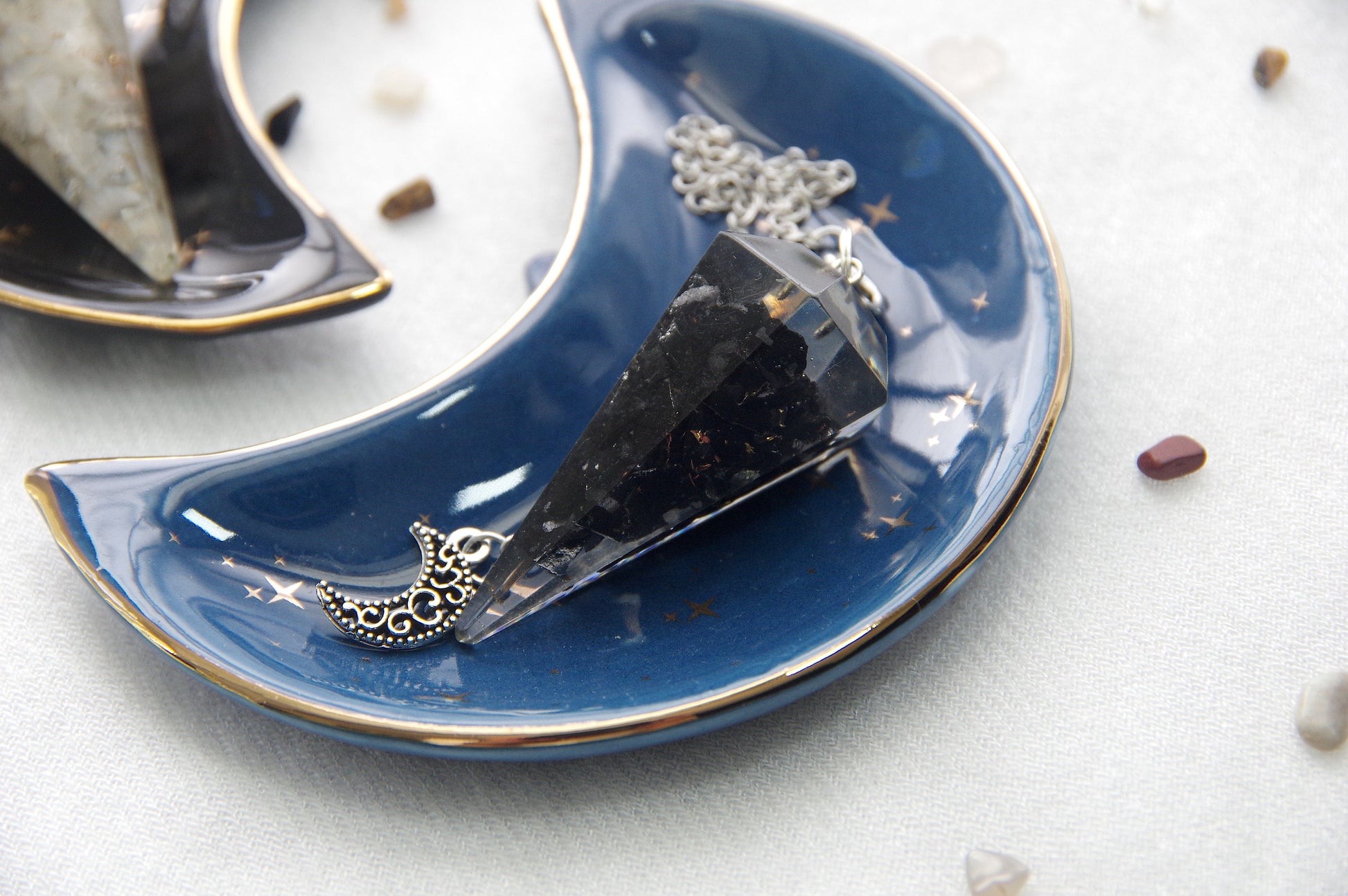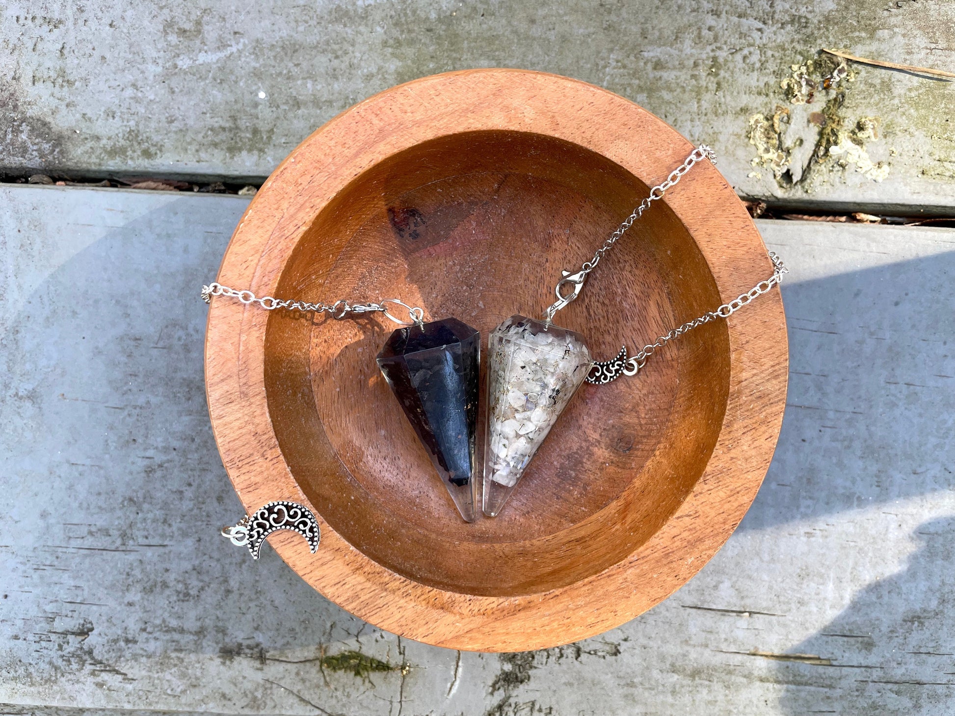 Full Moon/New Moon Orgone Pendulums. Sold by set or separate. Mini wooden bowl included