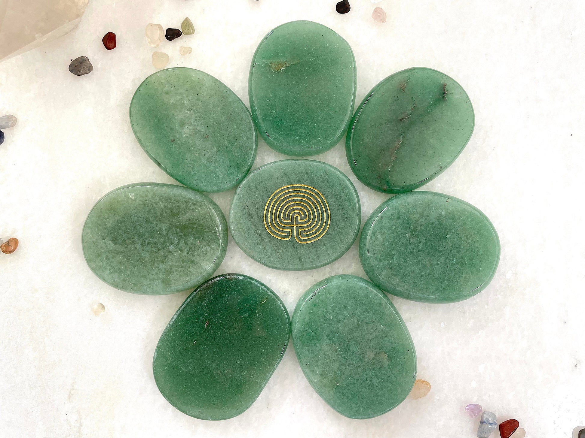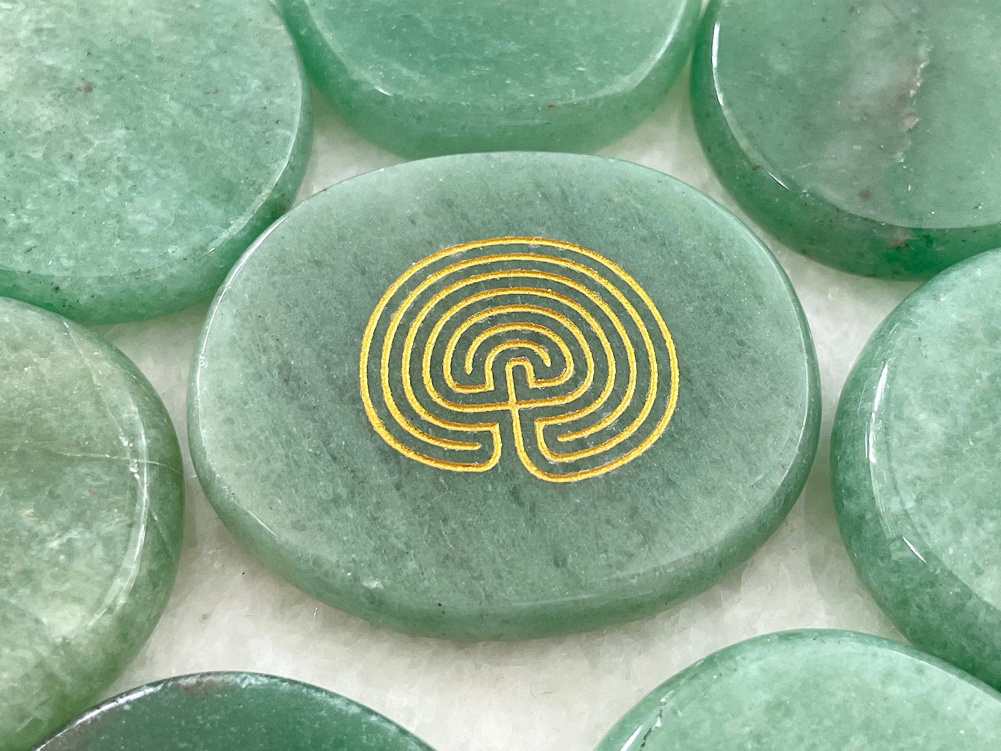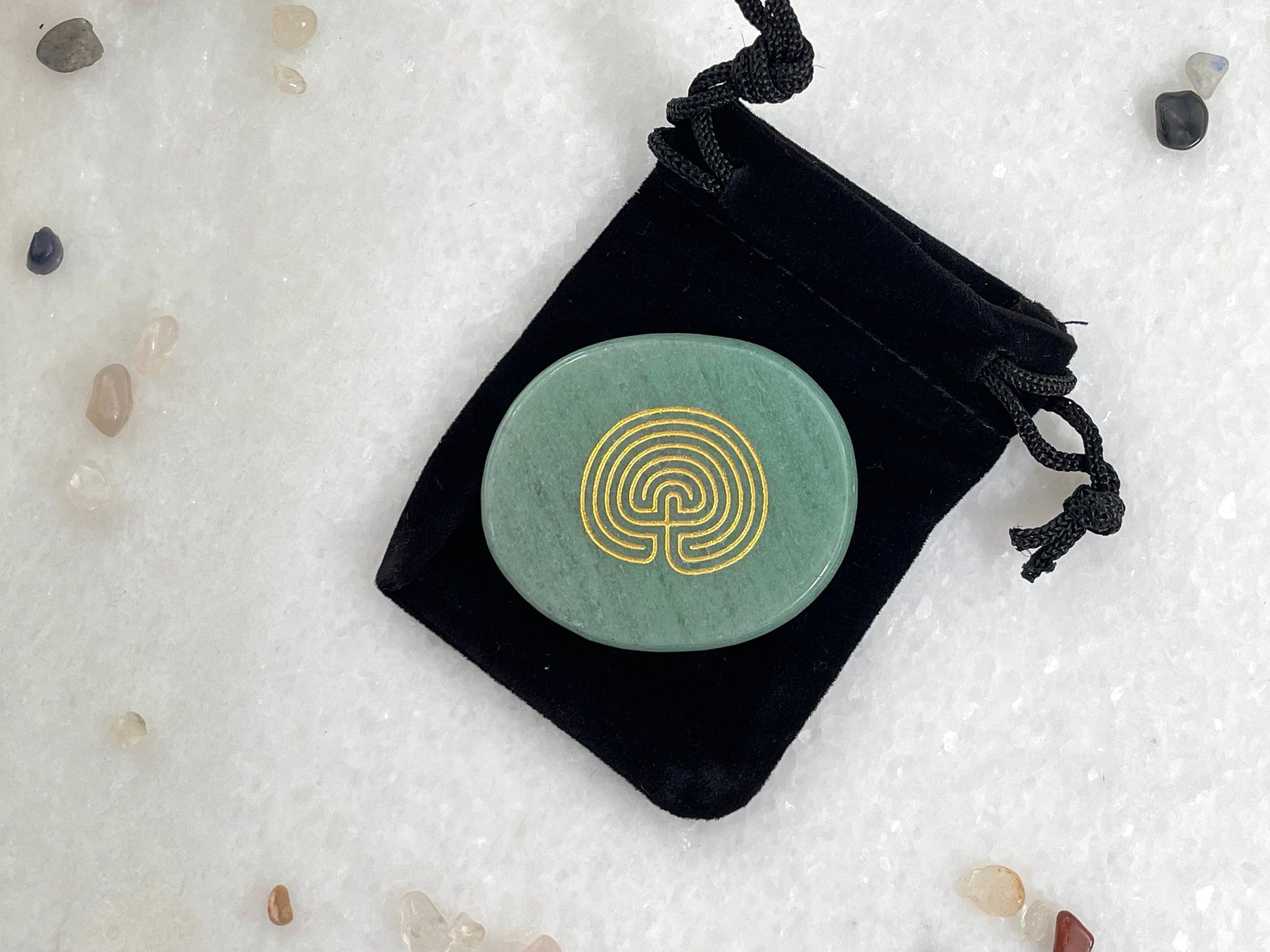 7-circuit Labyrinth Engraved in Green Aventurine. Flat and polished on both sides. Engraved on one side.