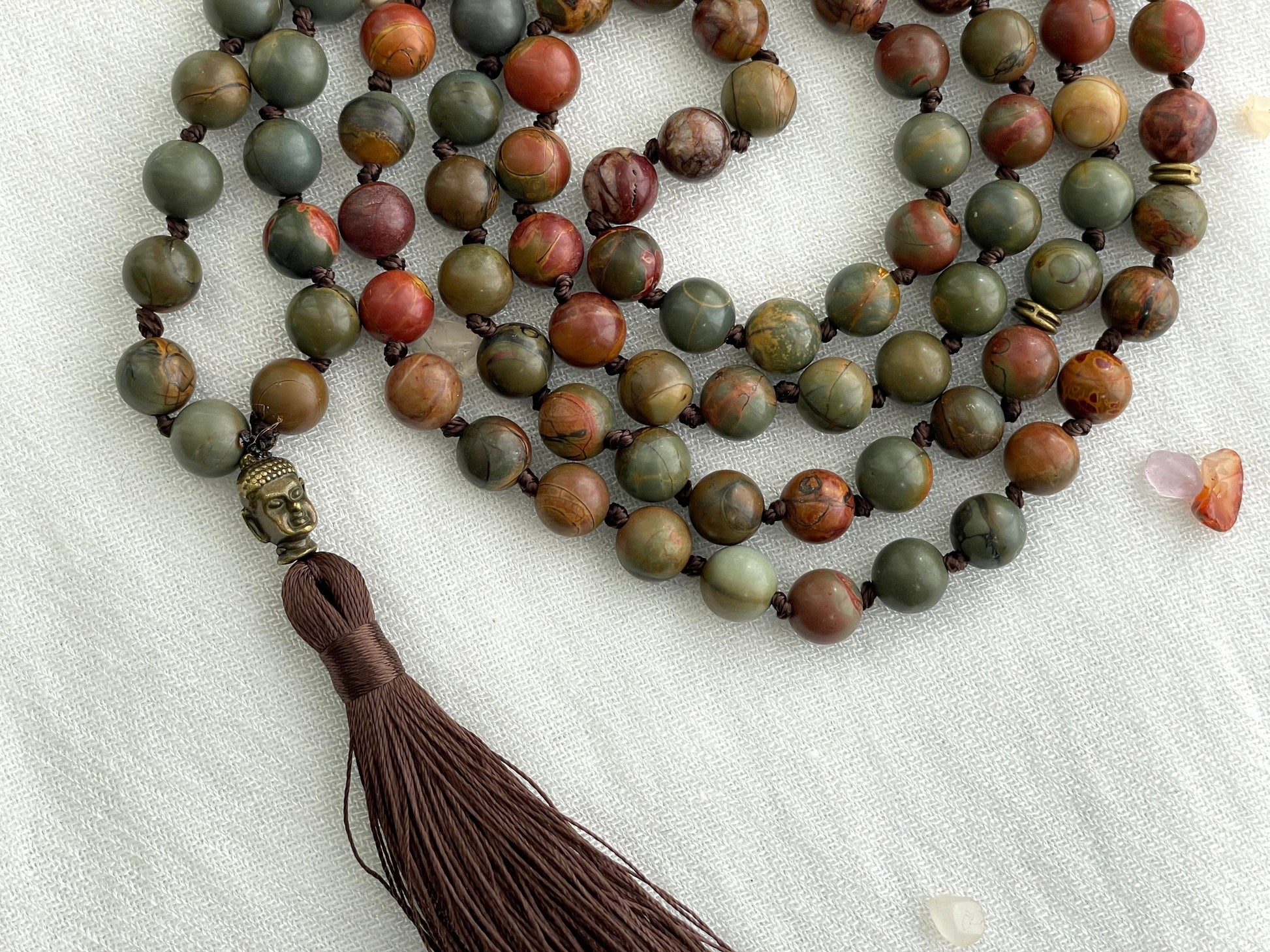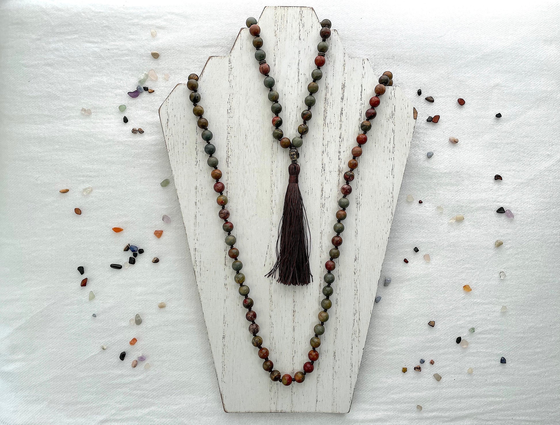 Picasso Jasper 108 Mala Bead Necklace. Knotted