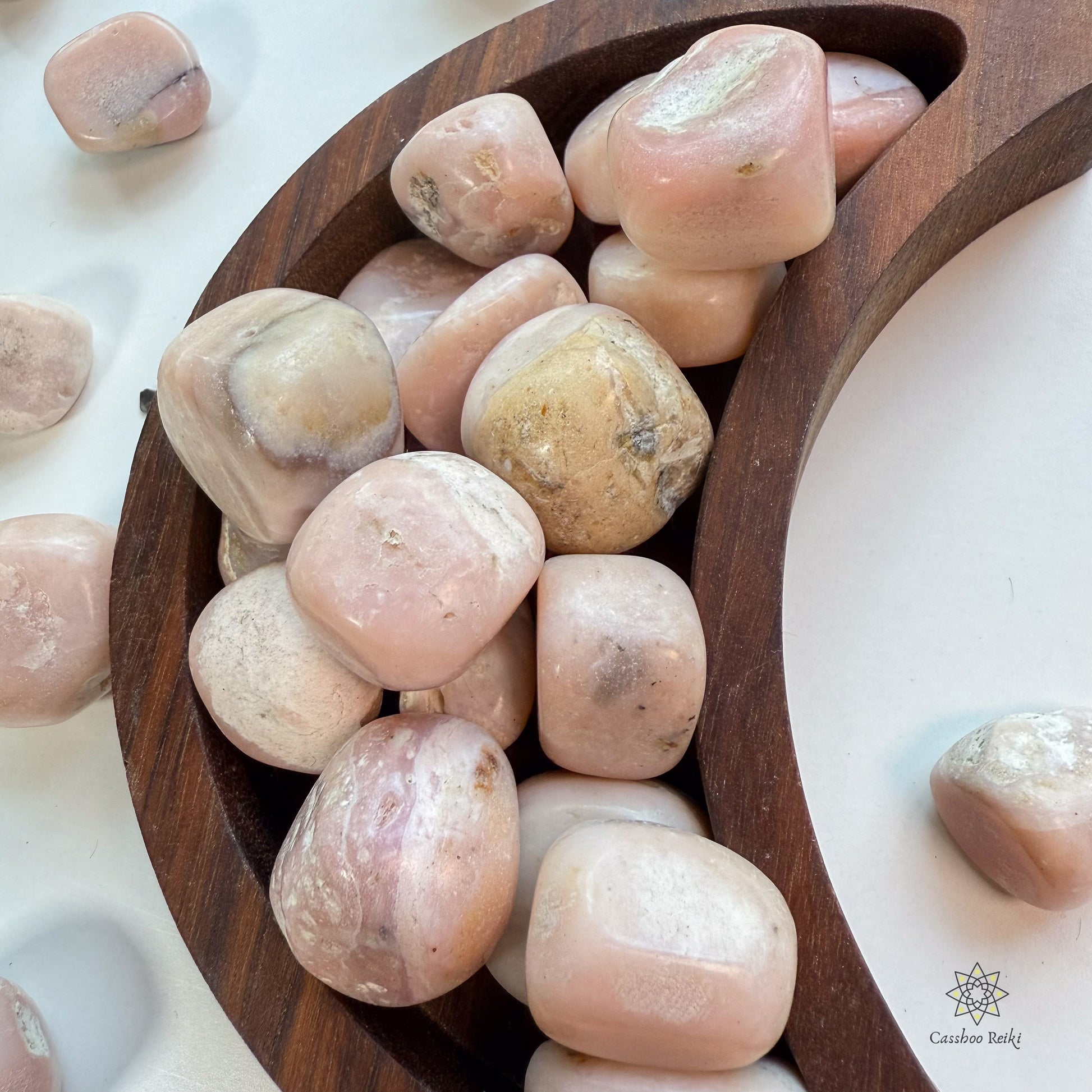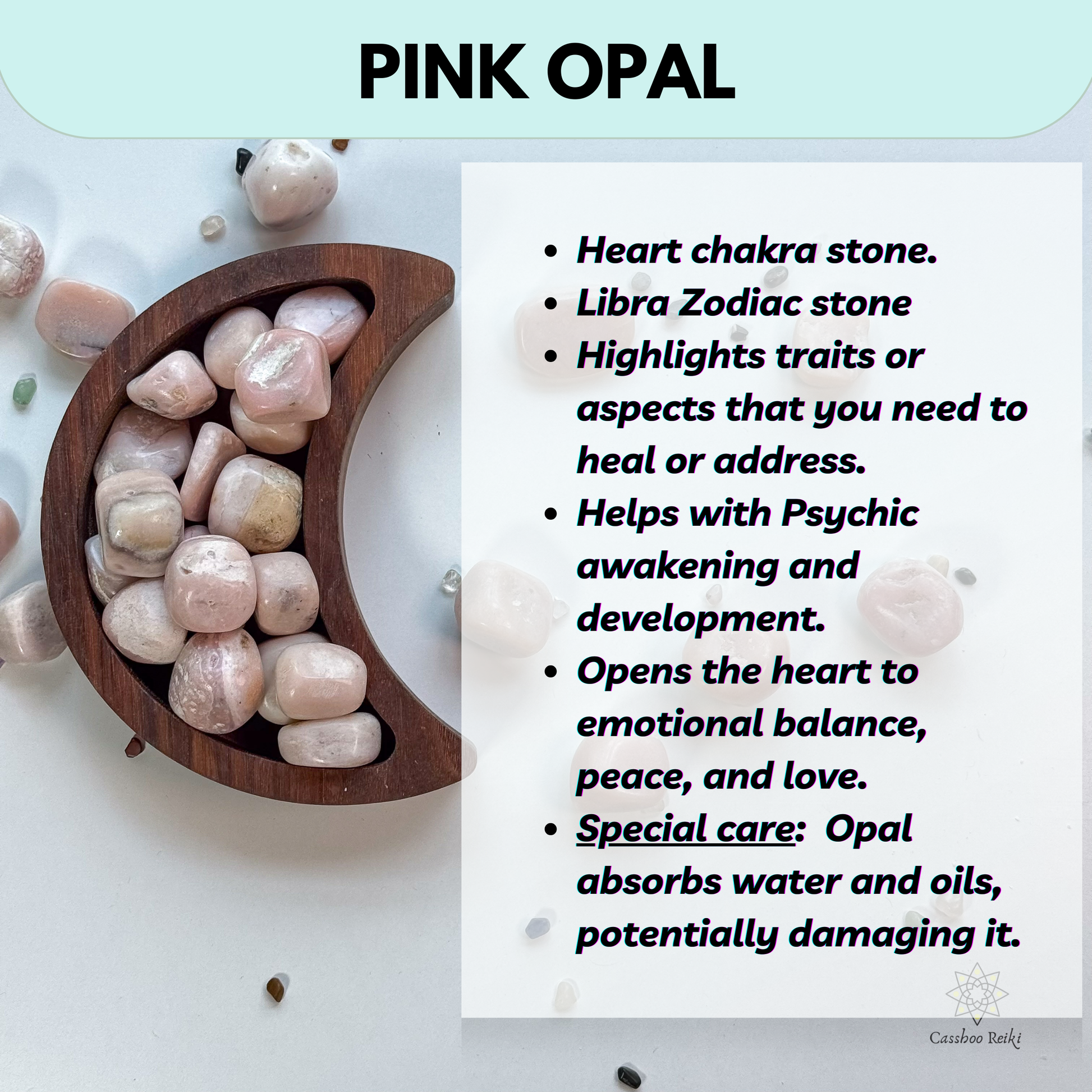 Pink Opal helps to bring about emotional balance for healing matters of the heart. Their healing properties have a gentle frequency that help to calm and soothe your emotional body, clearing and calming the heart to bring a sense of love, peace and hope.