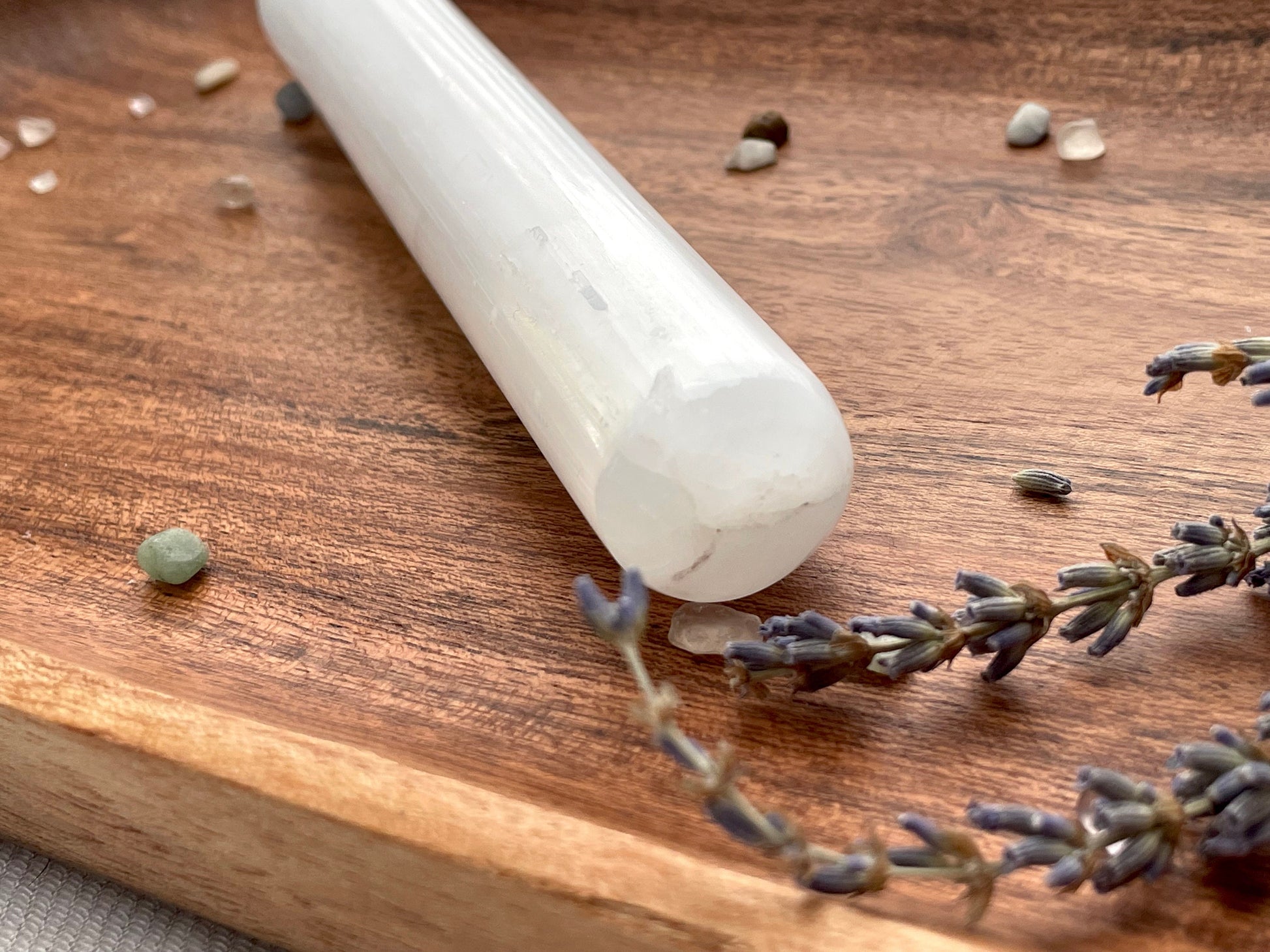 Natural selenite polished wand with rounded ends, perfect for massage or aura cleansing.