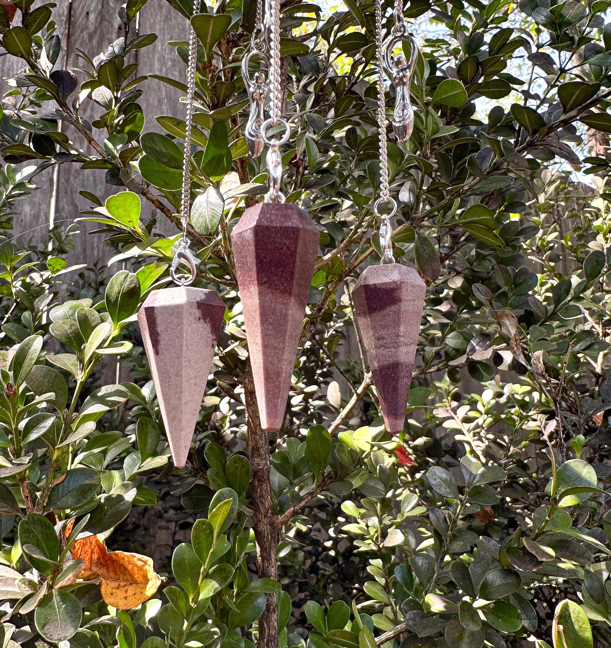 Hand-carved in natural gemstone. Polished in the form of a six sided polished pointed pendulum.