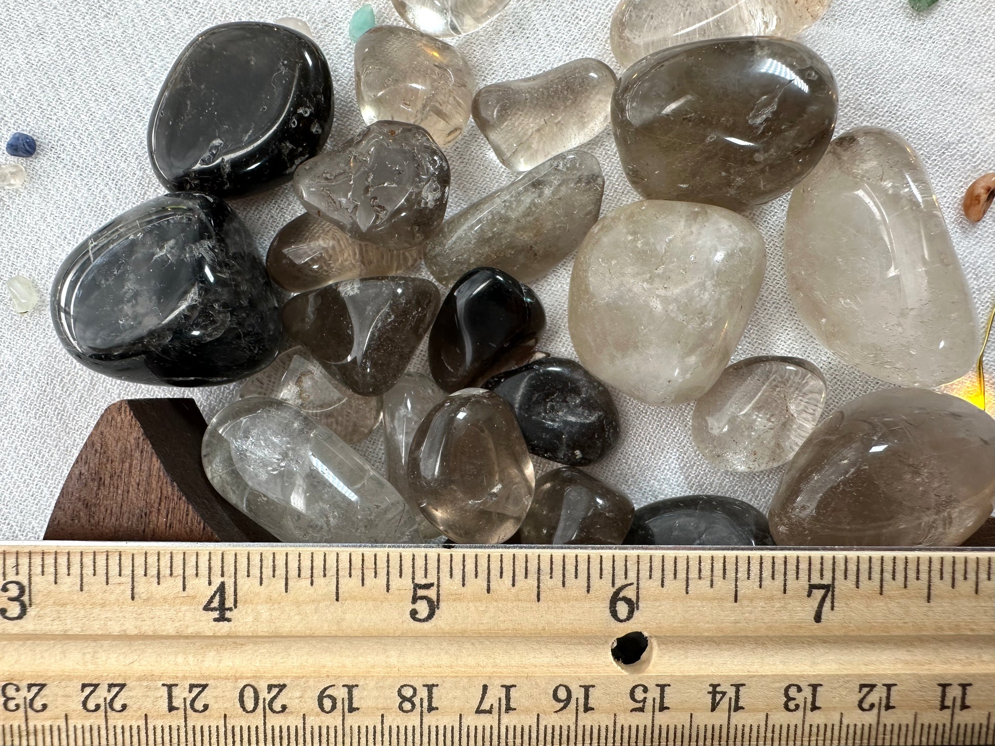 Tumbled smoky quartz in various sizes and tones of grey/brown.