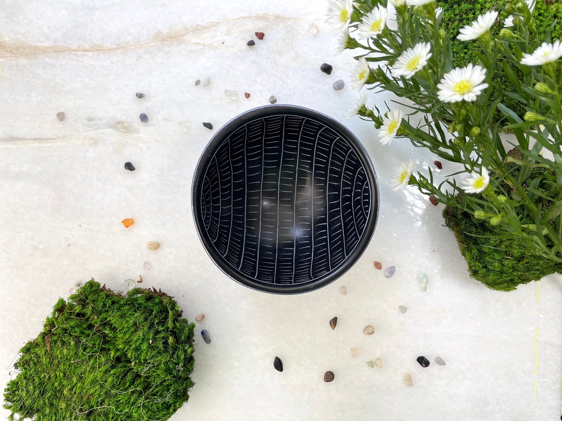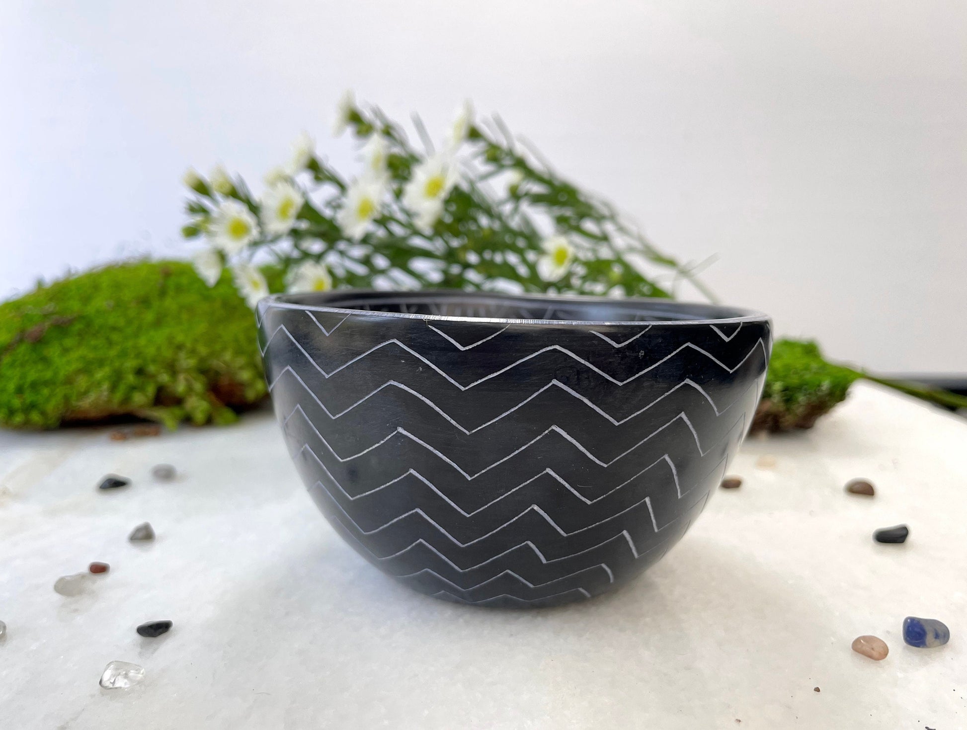 The bowl is hand carved out of soapstone, sanded until smooth, and dyed. Then an artisan uses a chisel to etch the patterns into the inside and outside of each bowl.