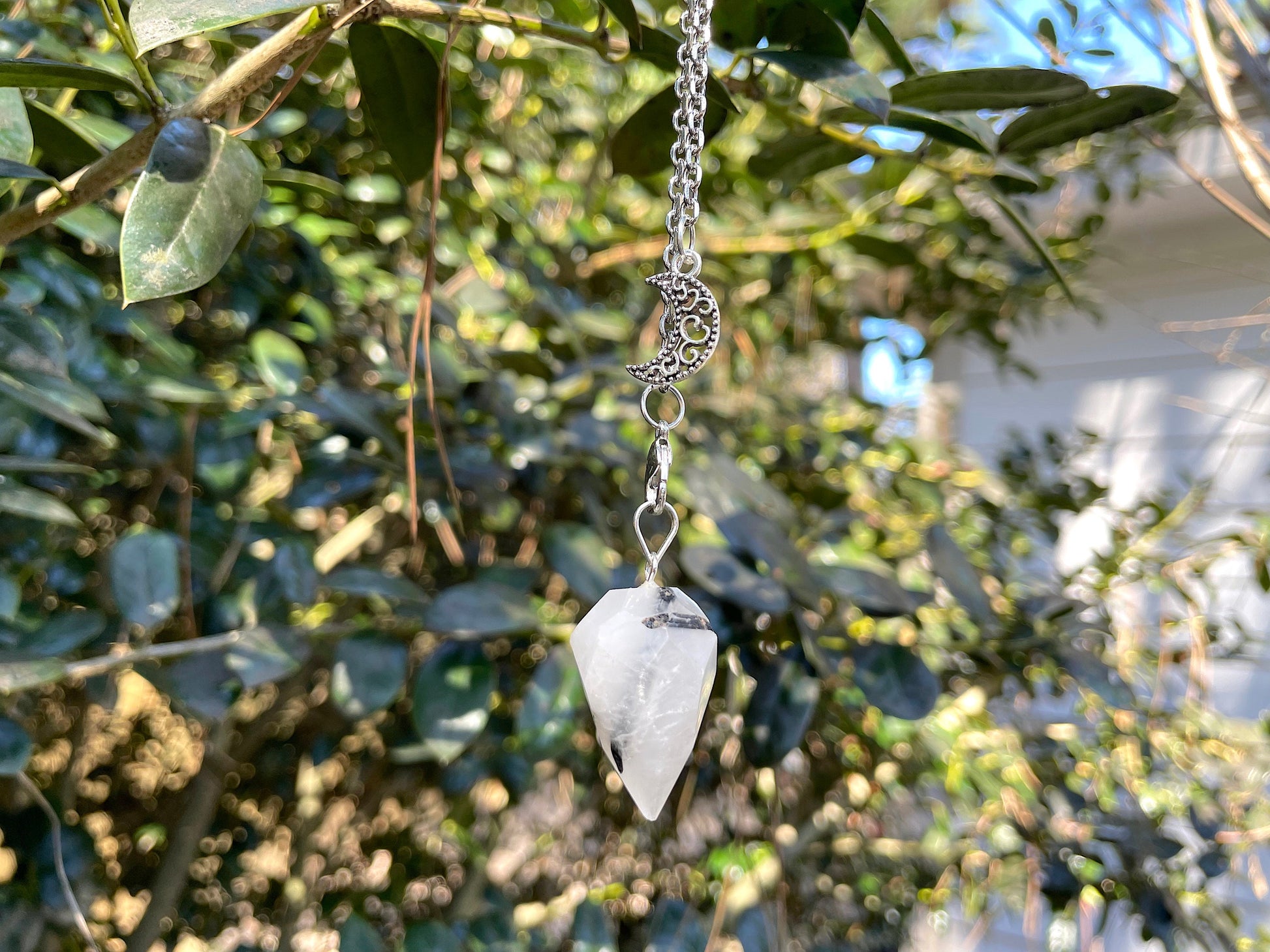 Natural Quartz with black Tourmaline inclusions in a multifaceted cut, with a Crescent Moon pendant.
