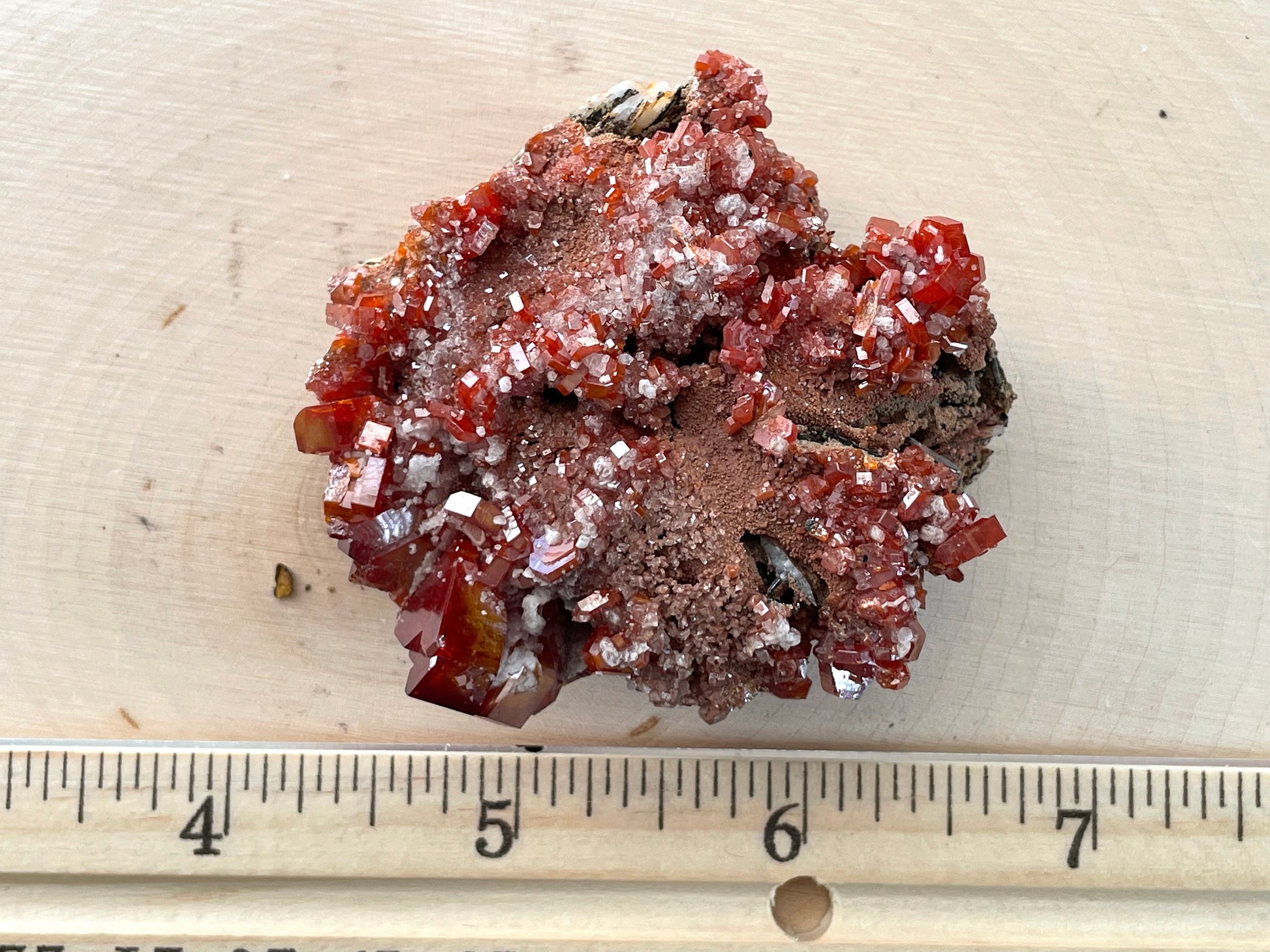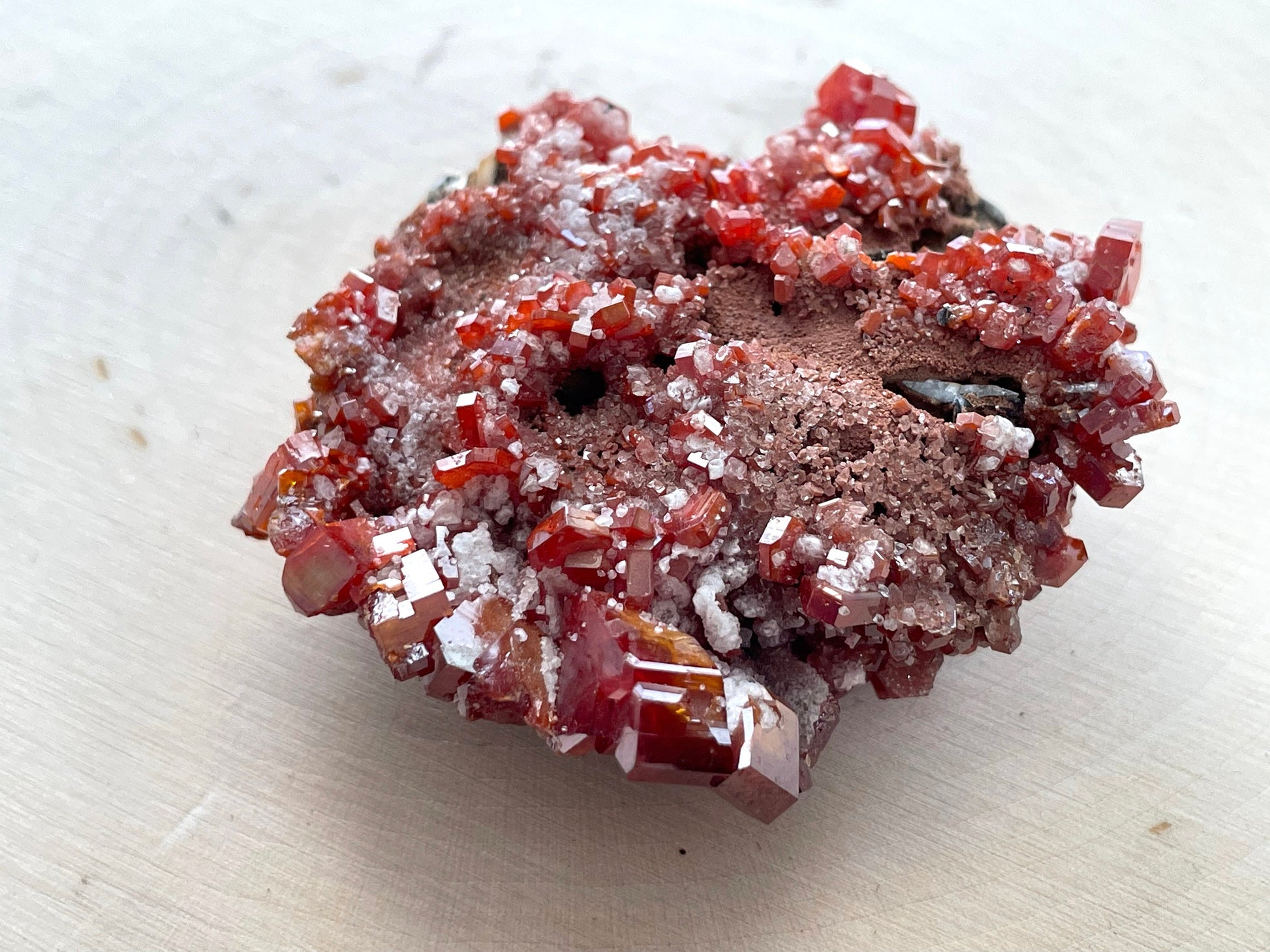 Vanadinite is a secondary mineral, meaning that a chemical process turns one mineral into vanadinite. Because of this, it is more uncommon than most minerals and is found in the oxidized zones of lead-bearing deposits.